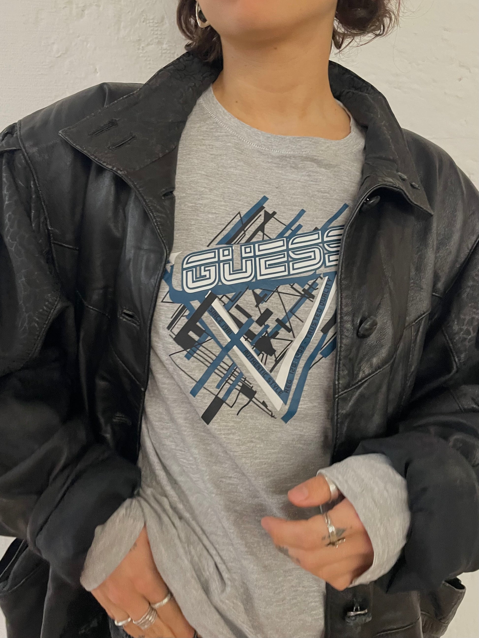 Vintage Leather Jacket Puff Sleeves Oversized Black – L