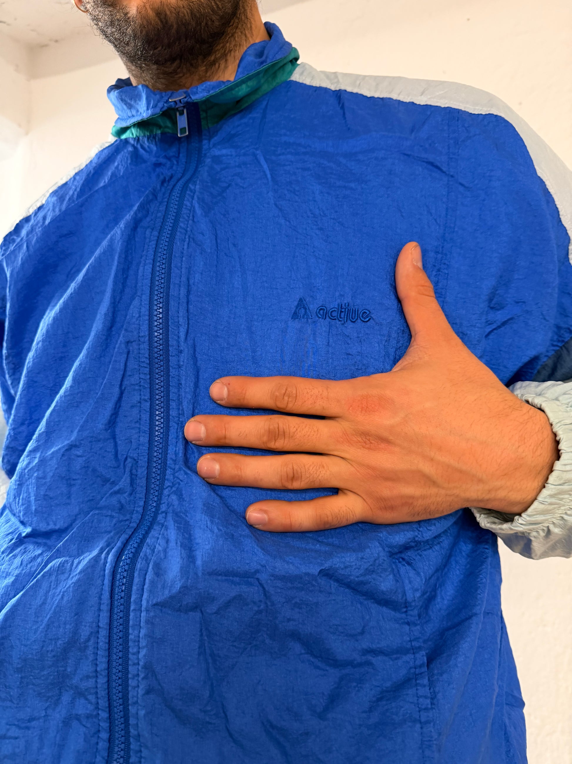 Vintage Track Jacket Blue White & Turquoise Polyester Unisex – L