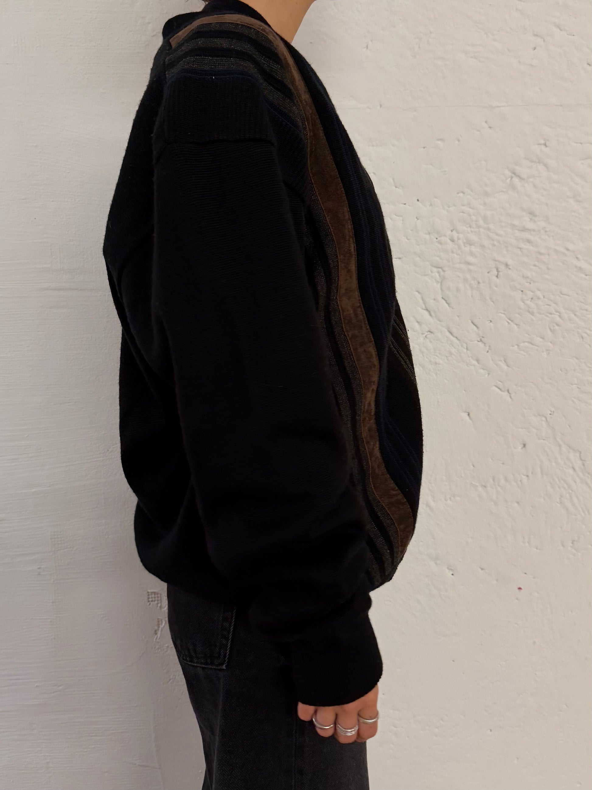 Vintage Wool Cardigan Brown Stripe Details Unisex – L
