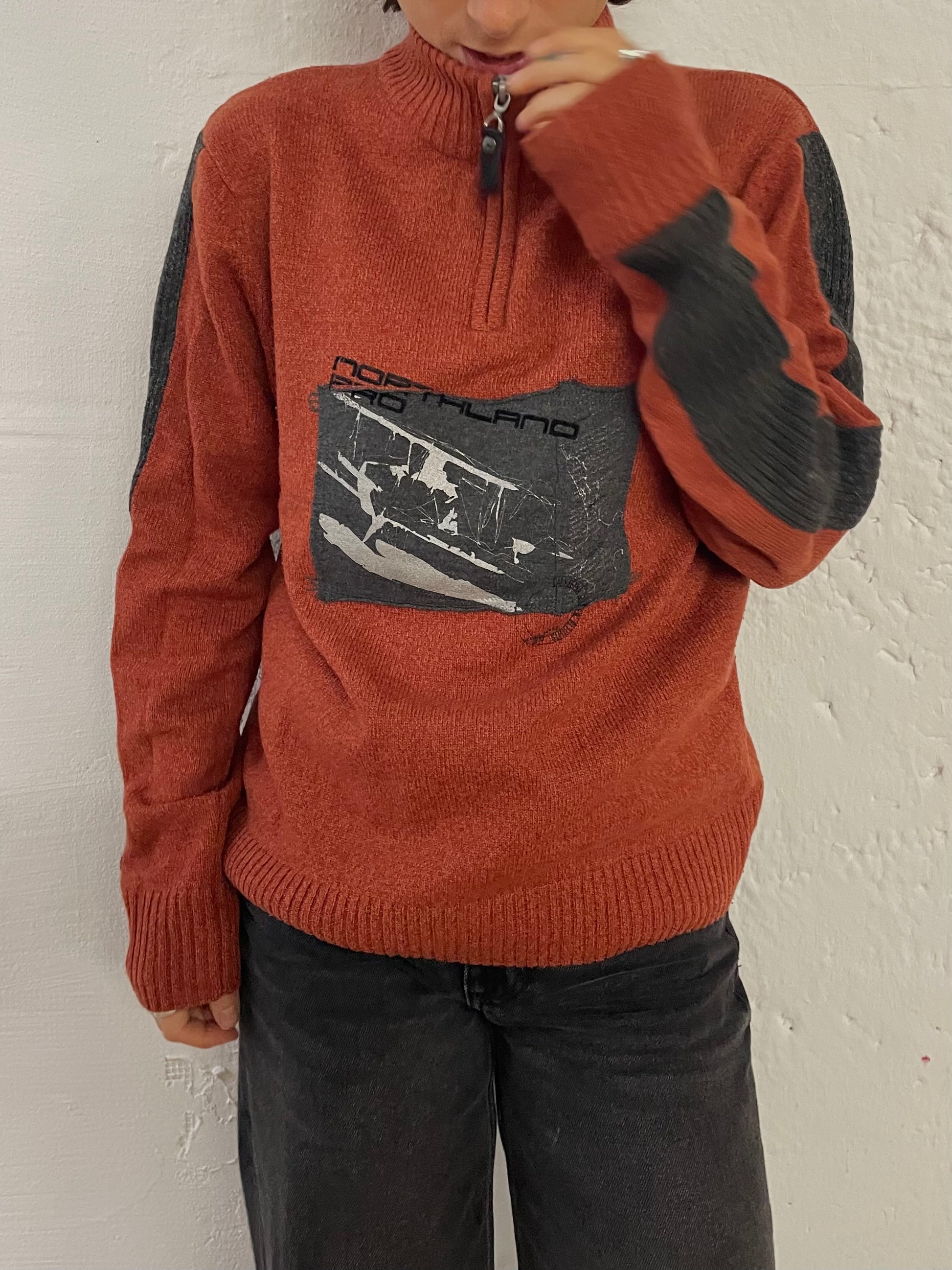Vintage Wool Zip Pullover Orange Front Pattern – S